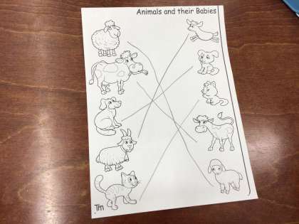 ひと通り動物の言い方を学習したら、親子の動物を線で結ぶプリントに取り組み、親子マッチングゲームをしました。とても盛り上がりました。