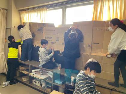 段ボールで窓をふさぎ、教室を真っ暗闇に。(換気は十分にいたします)