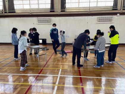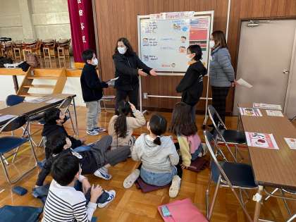3つのグループに分かれて、外国人の先生の話をよく聞き、体を動かして学びます。