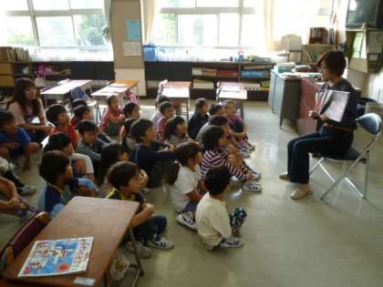 各教室で、絵本やお話の本を紹介していただきました。子どもたちは、とても楽しいお話に目を輝かせ、真剣に聞き入っていました。