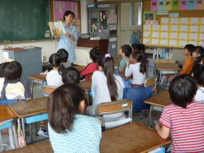 朝の時間(8時25分〜35分)を活用して、学校運営委員会の皆様を中心に保護者・地域の皆様の協力をいただきながら運営された「夏休み図書室開放」でお世話になった2人のボランティアの方に、読み聞かせをしていただきました。
