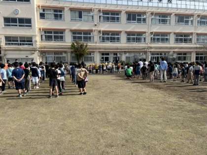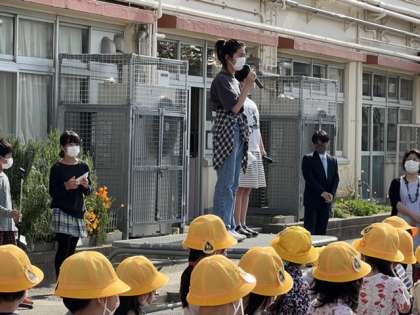 水曜日の朝の時間に、校庭で「1年生を迎える会」が