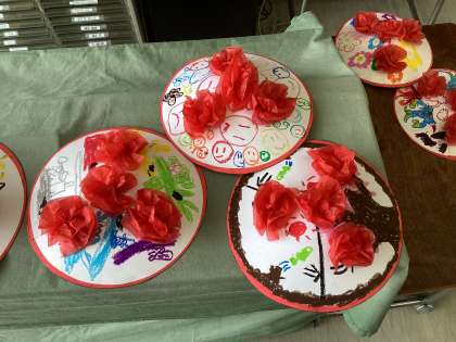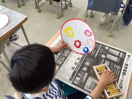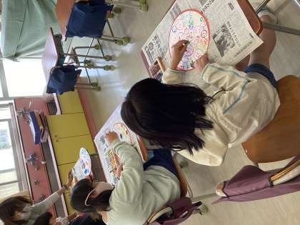 図工の時間にオリジナル『ミニ花笠』を作リました。一人一人が花笠に絵をクレヨンで描いて小さな花をつけて完成させました。様々な模様やキャラクターなどを描いて楽しんで取り組みました。