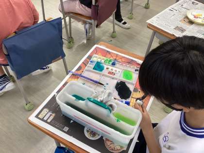 今日は納得のいく色を配合して塗る子や仕上げのニスを塗る子、既存の和紙を貼りつける子など、進度はそれぞれです。それでも、全員がストラップの色塗りを完成させ、ストラップにするための穴を開けるところまできました。