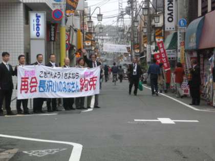 校庭での盛大な見送りを受け、梅丘商店街を通り、梅ヶ丘駅へ向かいました。