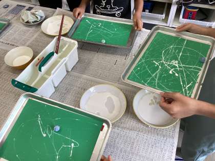 カラフルな思い思いの作品に仕上がりました。カタツムリだけではなく、葉っぱも作成しました。ビー玉を転がして、かたつむりの歩いた跡を描きました。