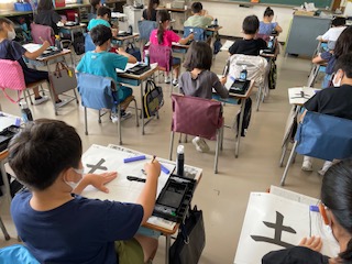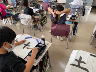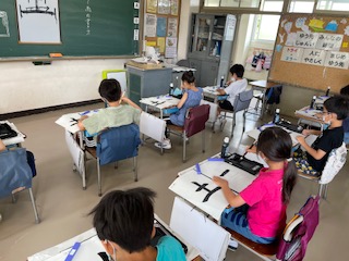 書写の時間、毛筆で「たて画」の練習をしました。