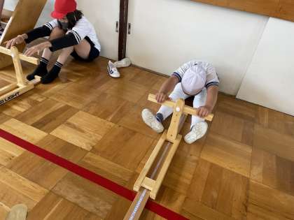 スポーツテストでした。 長座体前屈で頑張ってます!