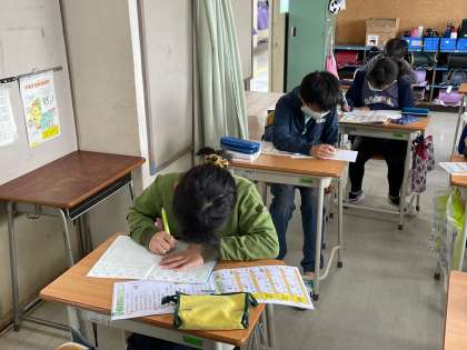 5年1組、朝のモジュールの時間で新出漢字を黙々と練習している様子です。