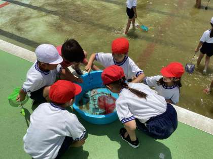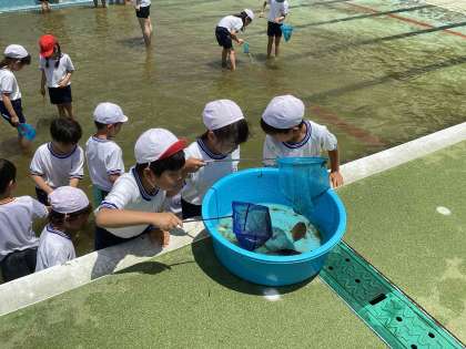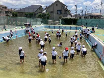 プールの清掃を前に、水の中にすむ生き物を救出する「ヤゴ救出大作戦」を行いました。