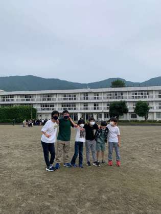 朝のお散歩のあと、宿舎をバックに記念撮影。