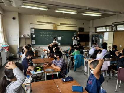 映像を見ながら確認しました。その後、児童が前に出て