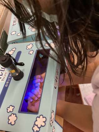 汚れに似せた液を手に付けて、ブルーライトを通して汚れを確認したあと、自分流の洗い方で手を洗ってどれぐらい汚れが落ちたかをもう一度ブルーライトで見てみました。