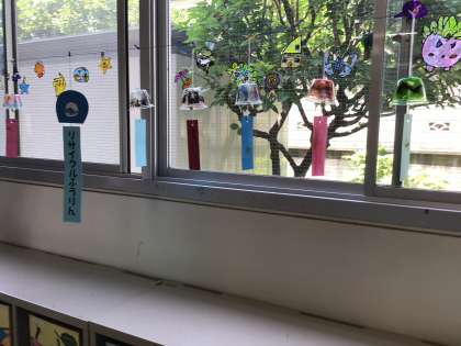 出来上がった風鈴は、仲よし学級の廊下に展示しています。ぶら下げた風鈴からはあまり音はしませんが、ゆらゆら揺れて、涼しい風が吹いているかのようです。