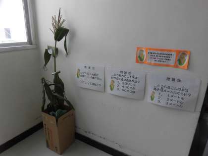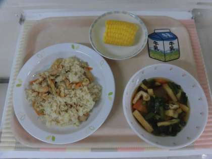 今日は、今が旬の「とうもろこし」をみんなで食べます。見本を飾っていたら、とうもろこしがどこにあるのか、1年生が一生懸命さがしていました。今日はお味噌汁にも「冬瓜」という夏野菜を使っています。