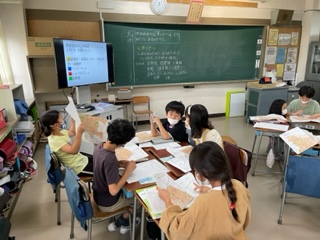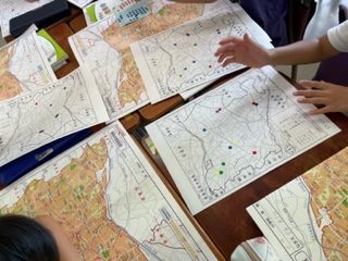 班で手分けして、公共施設の場所を調べて白地図にシールで貼ってまとめました。