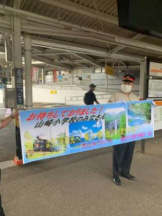 駅員さんが「お待ちしておりました。山崎小学校のみなさん」という横断幕を持ってお出迎えしてくれました。