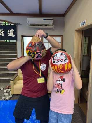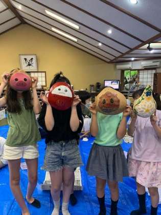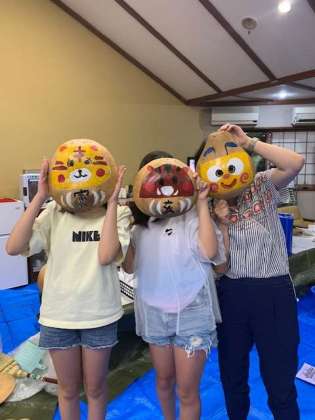 出来上がった作品をお面がわりに記念撮影です。