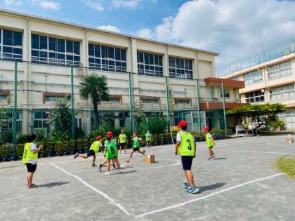 4年生はペットボールというニュースポーツに挑戦していめす。より楽しくなるように、みんなでルールを確認したり、工夫したりしながら取り組んでいます。