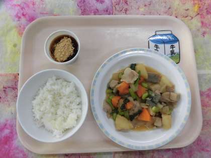 今日は黒糖を使ったデザートです。きな粉をかけて食べると、どこかで食べたことのある和菓子の味がします。きな粉が好きな子も嫌いな子も食べてくれたら嬉しいです。