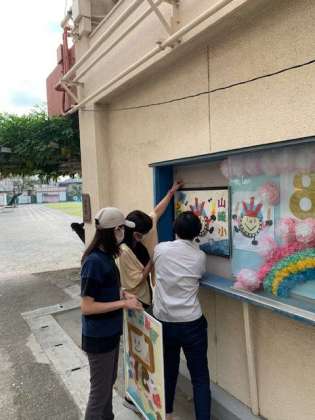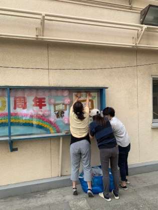 PTA周年委員の皆さんが80周年記念掲示板の仕上げをしてくださっています。紙漉き同好会の皆さんの力作の「ドンのすけ」と「わしのすけ」素晴らしい作品です。お祝いムードがぐーんとアップしますね。