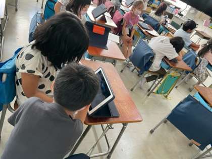 作ったクイズを、お互いのクラスで出し合っている様子です。