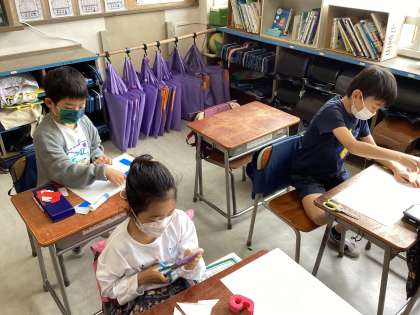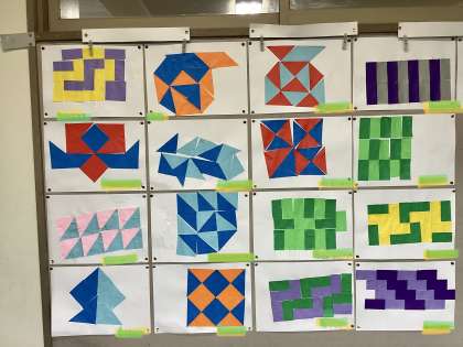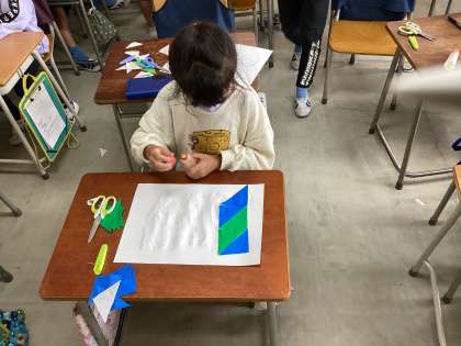 今日は、折り紙を直角を持つ図形に切り、それを隙間なく敷き詰めるという活動をしました。