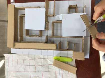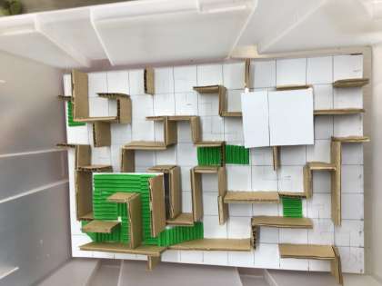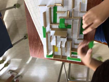 子どもたちは、何度も試行錯誤して、スタートからゴールにビー玉を転がすことができるように作りました。今週、出来上がったら、1、2年生も一緒に段ボール迷路大会をする予定です。