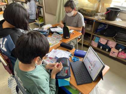 5年1組は、練習用の布を使って、なみ縫い・半返し縫い・ボタンつけなどをやっています。