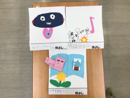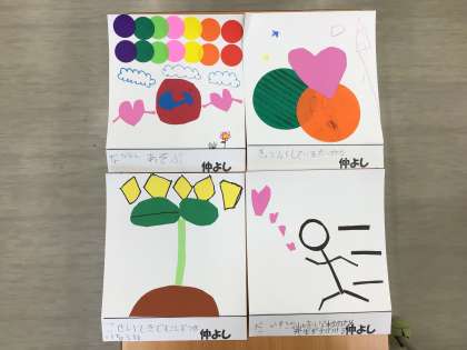 「優しい」「仲がいい」「個性的」「少しずつ成長している」など、仲よし学級からイメージする言葉を形や色で表しました。素敵なマークができました。