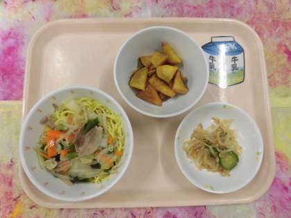 今日は、野菜がたくさん食べられるタンメンや、旬のさつまいもをフライドポテトにしたものなどをみんなで食べます。少しずつ秋らしくなってきましたが、食べ物でも秋を感じてくれたらうれしいです。
