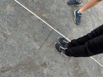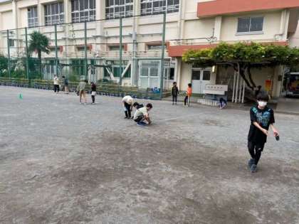 算数の平均の学習の終わりに、自分の10歩分の距離から、1歩が何cmなのかの平均値を計算してみました。自分の歩幅が分かると、大きなものでも何歩分かで長さを測ることができます。校庭にある遊具や、ネットの幅などを歩幅を使って調べました。