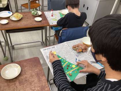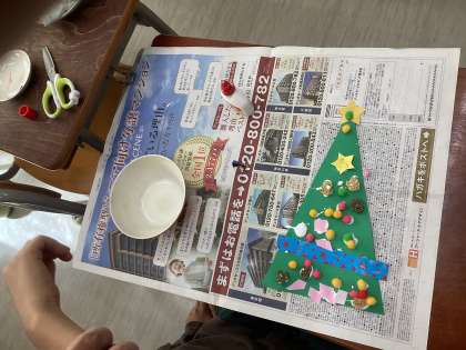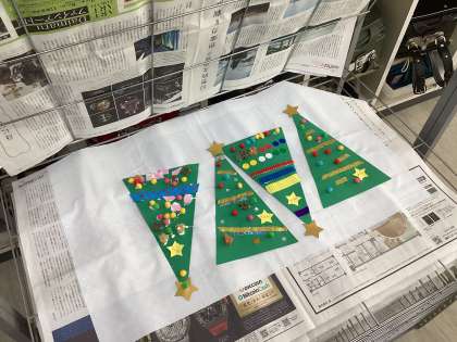 折り紙やシール、乾燥パスタなど様々な飾りをツリーにつけて個性豊かなツリーが完成しました。