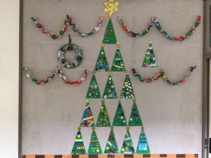 仲よし学級の廊下に、素敵なクリスマスツリーが飾られました。図工の時間に丁寧に作り上げた作品です。一人一人が工夫して作ったミニツリーを、大きな一つのツリーになるように掲示しました。