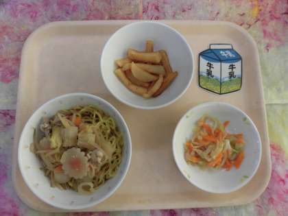 今日は「杜の学び舎献立第2弾」で若林小学校の「みそドレサラダ」をみんなで食べます。今日のサラダも美味しくできました。しっかり食べて、元気に過ごしましょう。