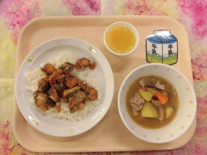 今日は「杜の学び舎献立第3弾」で、城山小学校の「しいらの揚げ煮丼」と「めった汁」をみんなで食べます。あまり見かけることのない魚「しいら」を油で揚げて、甘辛ダレをかけています。