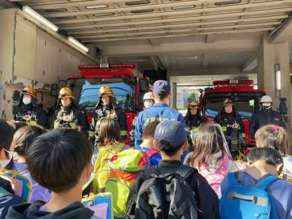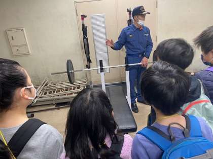出動するまでの流れを見せてもらい、あっという間に着替える様子を見て子供たちはびっくり!!