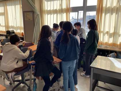 5-1、お楽しみ会のサッカーチームに分かれて、休み時間に作戦会議してます。