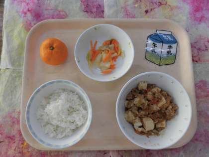 今日は「せたがや育ち大根総選挙」で惜しくも第2位になった「麻婆大根」をみんなで食べます。豆腐と大根が両方とも入っているので、いつもと違う食感が楽しめるかもしれません。だんだん冬らしさが増してきたので、旬の野菜や果物で栄養をとって元気に過ごしましょう。