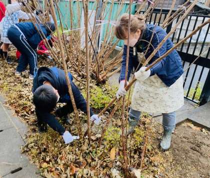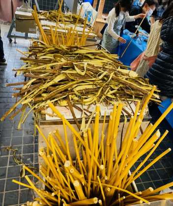工芸室の裏の楮の枝を刈り取り、皮を剥ぎ取りました。