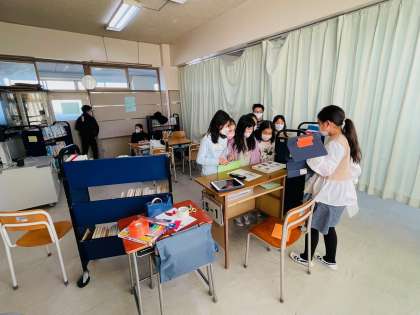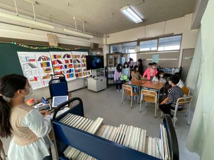 5-1は、教室に入るとそこは本屋さん。本屋の中で動画を見ると、ある一冊の絵本の中から6名のキャラクターが逃げ出してしまったので、探し出してほしいという依頼が。キャラクターたちは山崎小内を歩き回っていて、見つけるとスタンプがもらえます。全員見つけたら、ゲームクリアです。