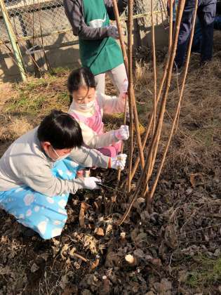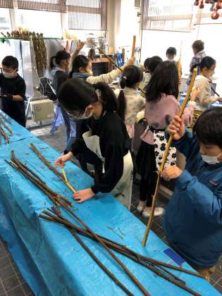 1月16日、19日とクラスごとで、楮の木を刈る、皮をむくの工程をしました。