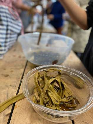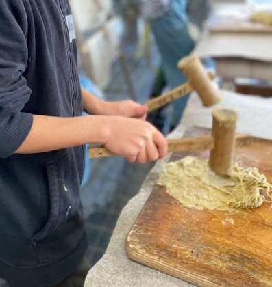 余計な黒い部分を取り除き、紙漉ができるように叩きました。