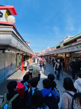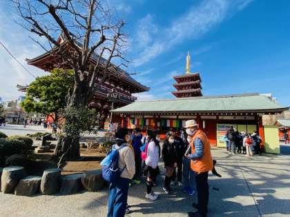 浅草では、台東区のボランティアガイドさんが、子どもたちに浅草の歴史や建造物などの説明をしてくれました。