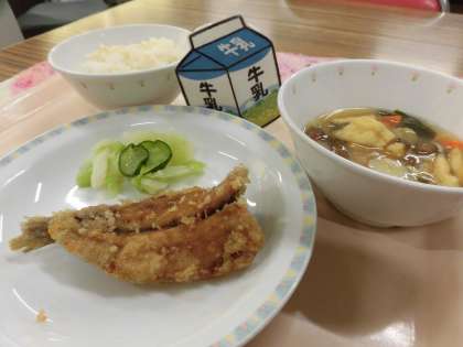 鬼の苦手な「イワシ」をかば焼きにしました。甘めのタレでごはんが進みそうです。大豆が原料の「油揚げ、しょうゆ、みそ」も使っています。たくさん食べて寒さに負けず、元気に過ごしましょう。