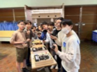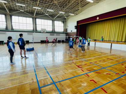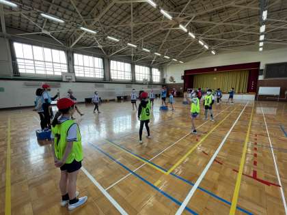 キャッチバレーボールのルールで、3回目でアタック、ローテーションしてゲームを楽しんでいます!