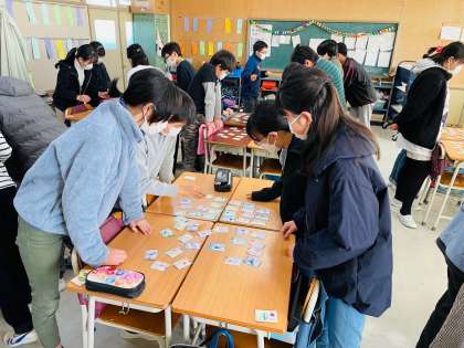 その都道府県の特徴をあらわすヒントを3つ読み手(担任)が言って、そのヒントを手がかりに都道府県のかるたをとっていきます。
