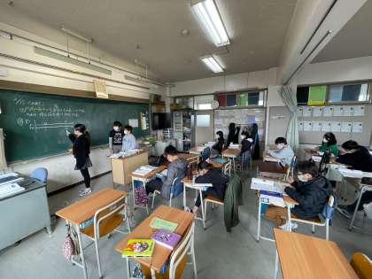 円周の長さから直径を求める方法を説明できる、というめあてに向かって教え合ってます。