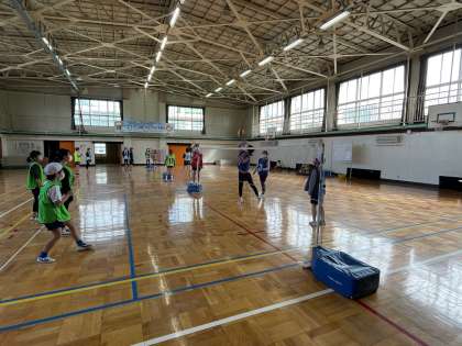 アンダーハンドやオーバーハンドパスはなしで、キャッチしてOK。三段攻撃のリズムで試合を進めることを楽しんでいます!回数を重ねると、だんだん上手になってきています。