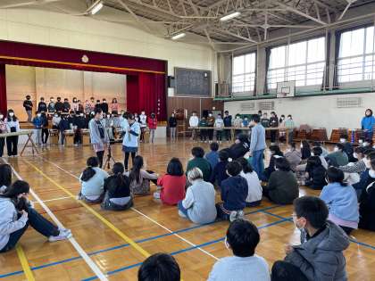 6年生が、太鼓の演奏を通して見せてくれました。圧倒されていました!5年生からの感想タイムです。